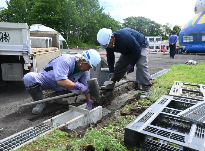 5年目を迎える地域貢献活動。6月25、26の両日に実施し、ことしは5人が参加した。こども動物園横の園路を整備し、観覧車付近の浮き上がっていた雨水桝を切り下げた。川原薫土木部長は「子どもたちが走り回ってもつまづかないように」と話していた。