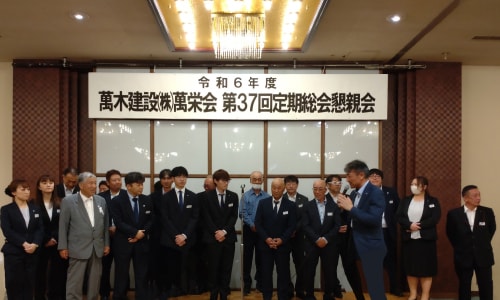 令和6年7月3日第37回萬木建設株式会社萬栄会定期総会・懇談会を開催いたしました。コロナ禍により、5年ぶりの開催となりましたが、会員総数53社のうち、17社が新規入会し大盛況となりました。萬栄会会員とともに、これからも頑張ってまいります。