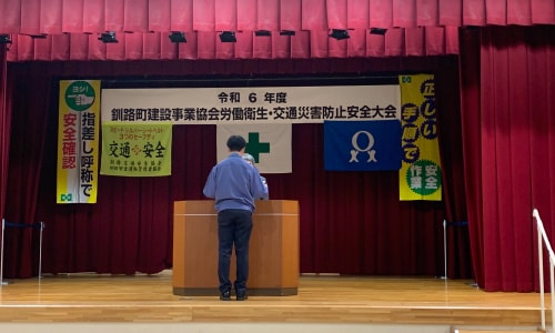 令和6年6月26日令和6年度釧路町建設事業協会労働衛生・交通災害防止安全大会が行われました。入社2年目の土木部 小林莉来が安全宣言を行いました。